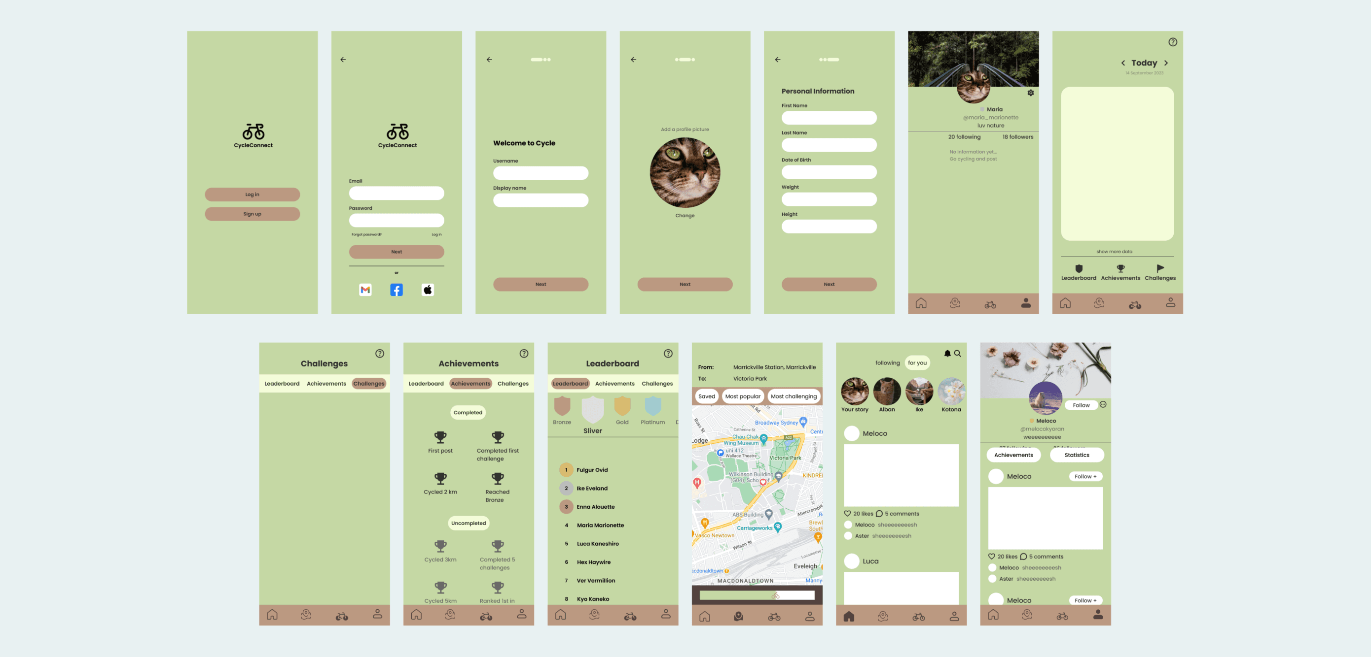 For DECO2102 Introduction to Interface Design, I created CycleConnect, an app to enhance social and leisure cycling for young adults. I handled research, user testing, wireframing, and prototyping, focusing on features that promote community engagement, personalised route planning, and progress tracking. The project addressed a lack of socially-driven cycling apps and was refined based on design review feedback to ensure usability and novelty in the solution.