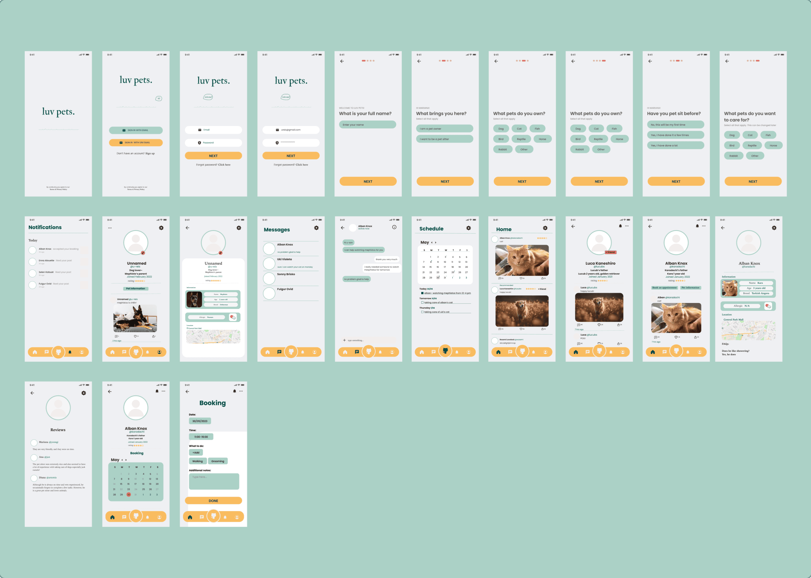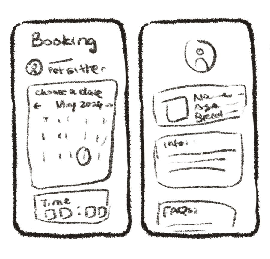 As this was an individual project in my first year, I was still learning the fundamentals of design tools and processes. I created mid-fidelity prototypes using Figma, exploring how the app could support student pet owners. To help structure the app’s flow, I used basic information architecture mapping to organise key features like booking a pet sitter and viewing pet profiles. I also conducted simple user testing, gathering feedback from peers and using it to refine my designs, focusing on improving clarity and usability as I built my confidence with UX tools and methods.