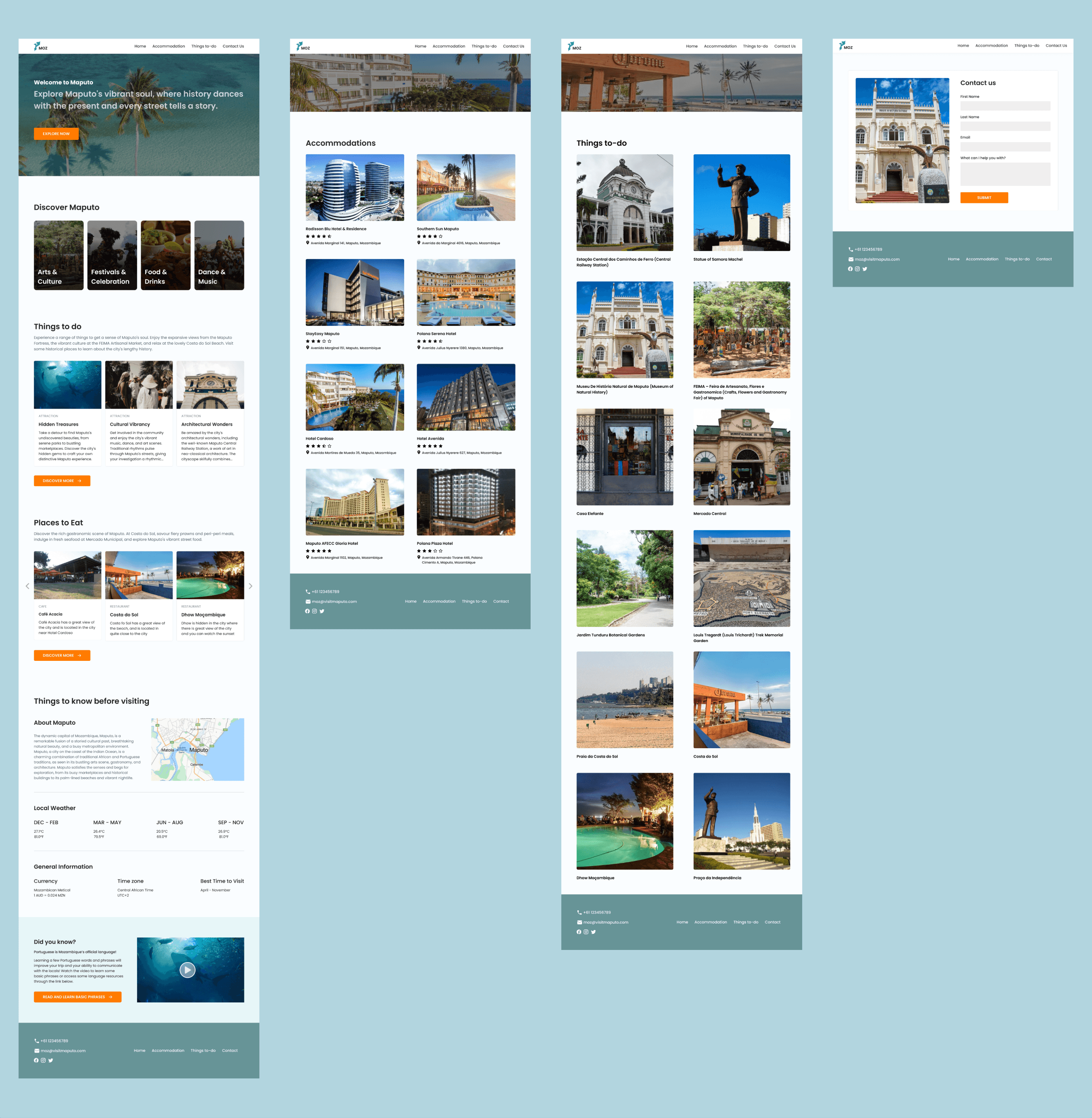 Home Page : Offers essential information for first-time visitors to Mozambique, including average monthly weather, currency, time zone, and best times to travel. It also features a short video showcasing Maputo's scenery and a link to learn basic Portuguese, helping users feel more prepared and connected.